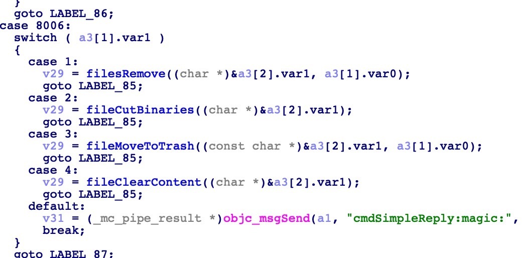 为了省事,我决定编写一个能够删除任意文件的POC。我可以通过调试程序下断点的方法去弄清楚这里的参数是什么,因为一开始就说了这是一个垃圾清理软件,当我用垃圾清理或者程序删除之类的功能去删除root用户文件的时候前台进程是没有权限删除的,它肯定是调用sendDataToDaemon函数把消息发给daemon进程让daemon进程去删的,所以调试程序触发断点很方便。