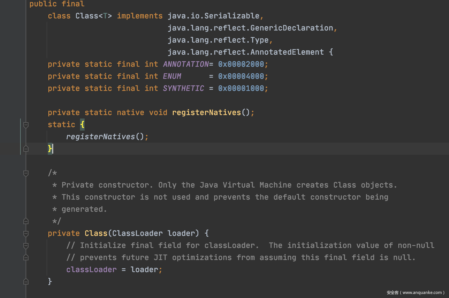 Class类的构造方法为private属性,也就是只能类内部调用,类实现关系和构造方法如下所示:
