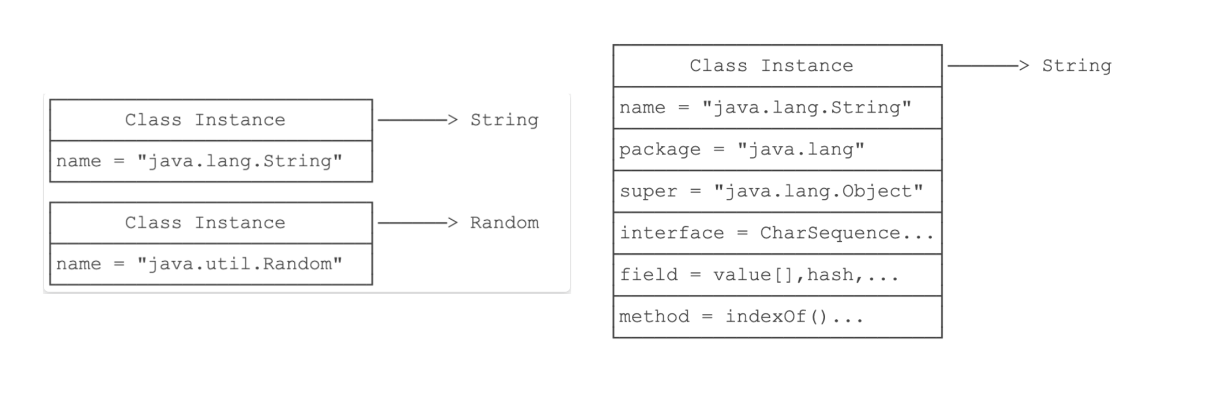 以String类为例创建方法如下,当JVM加载String类时,它首先读取String.class文件到内存,然后,为String类创建一个Class实例并关联起来: