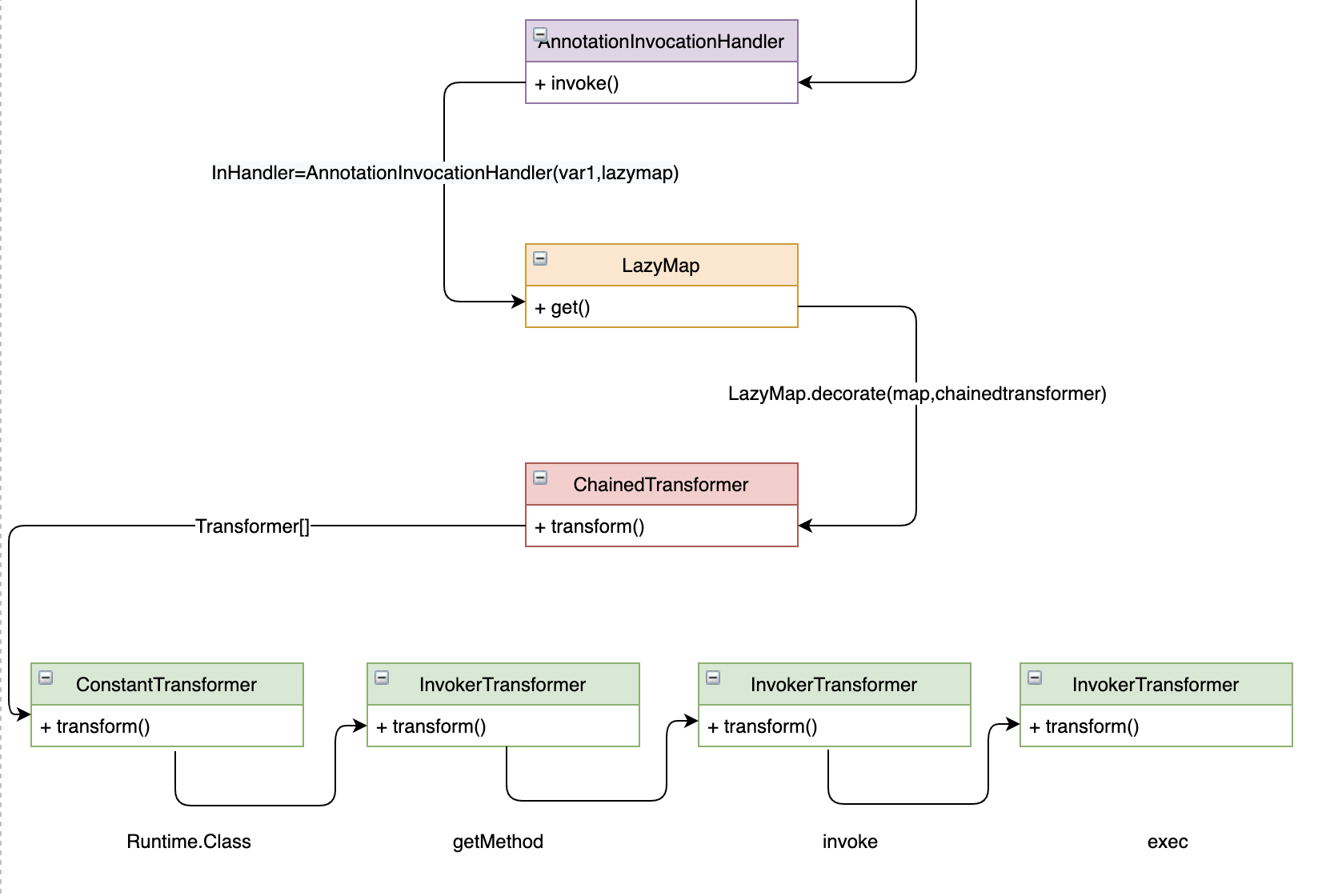 以上是现成的执行链,其中有很多特殊的构造技巧,比如ConstantTransformer不论transform函数参数是什么,都会返回ConstantTransformer的构造参数。第一句和第二句的组合相当于执行以下语句
