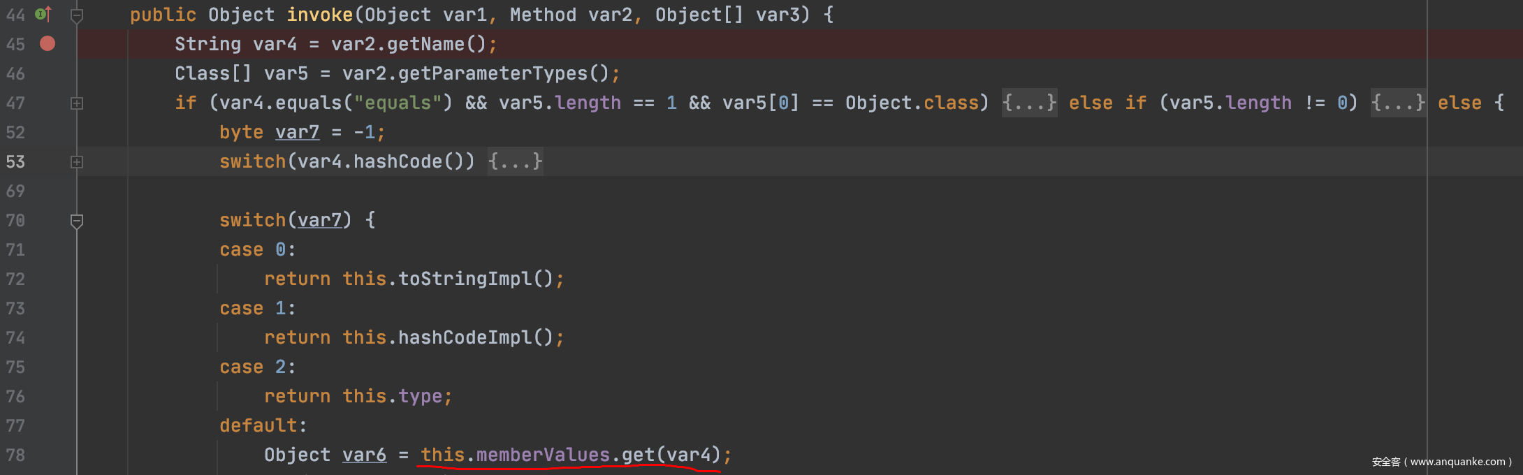 同时发现在readObject方法中有memberValues的方法调用,所以我们可以把memberValues设置为代理类,当调用entrySet方法时触发代理类的invoke方法。