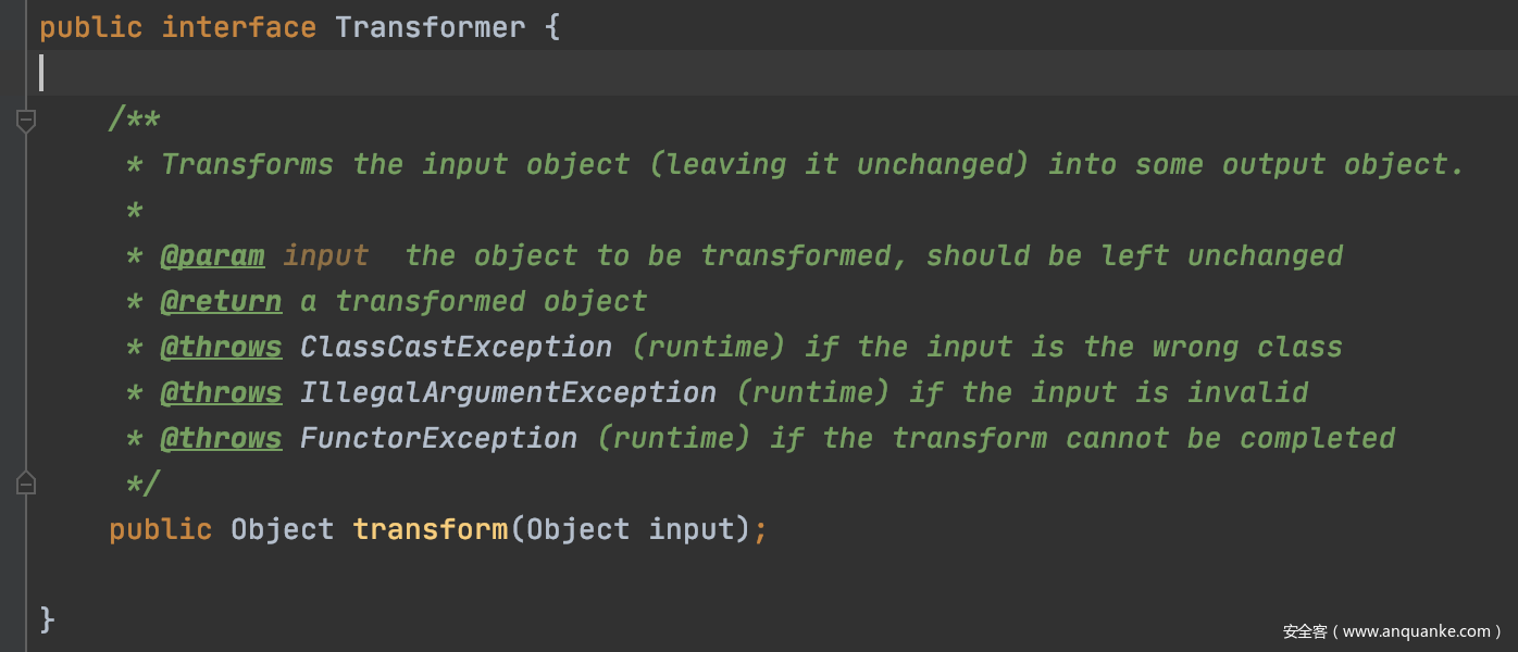 介绍过类与反射之后,看一下CommonsCollections1 链里的实现技术,基于接口的多态,这里的接口指的是 Transformer,定义如下