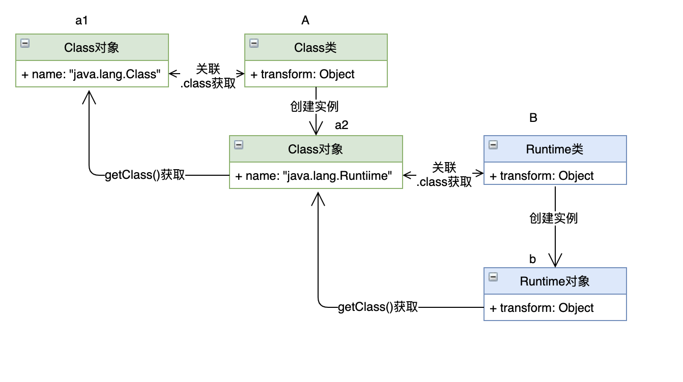 反射技术的基础就是每个类都有个Class对象,Class本来是个类,这个要与class分清楚(这里的class是类型)。每个类在JVM加载运行的时候都会new一个Class对象出来保存类的一些方法和属性,并与类相对应。用图表示如下
