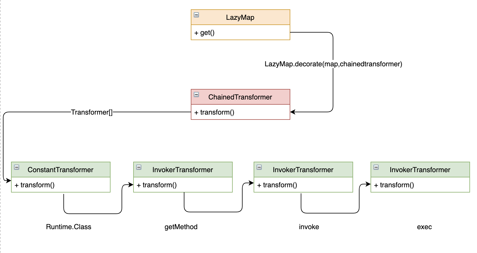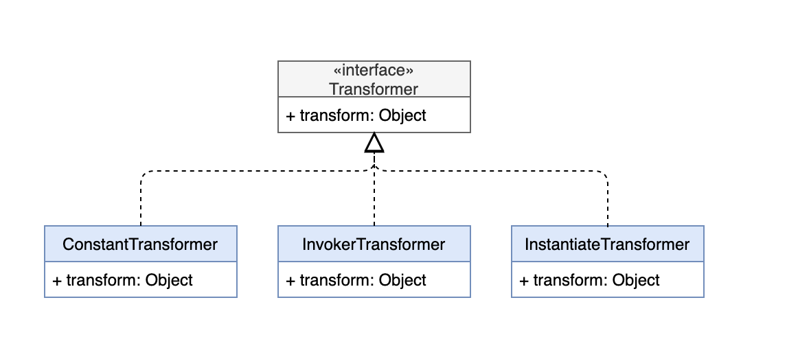 iTransformers的类型为Transformer接口,这就意味着可以通过向上转型的方式将它的三个实现类利用多态的能力填充在Transformer数组中,之后配合ChainedTransformer的transform方法,链式的调用iTransformers数组中Transformer类型的transform方法