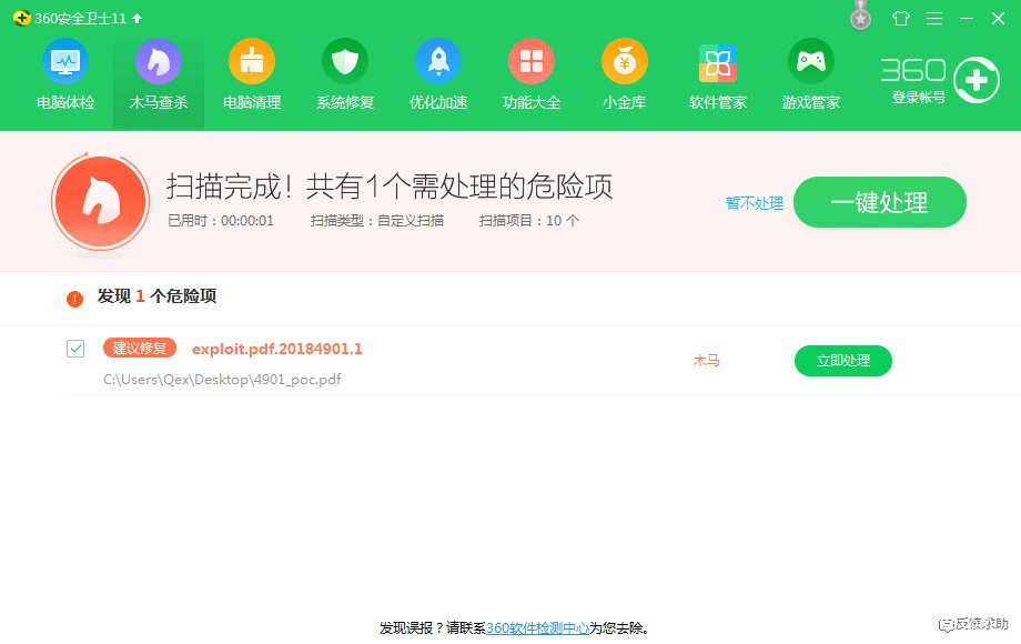 目前,Adobe官方已针对受影响版本提供补丁,用户可通过安全软件推送打好补丁;同时, 360安全卫士及360杀毒已率先支持对恶意文档的查杀防护,即使没打补丁,也能帮用户轻松免疫漏洞风险。