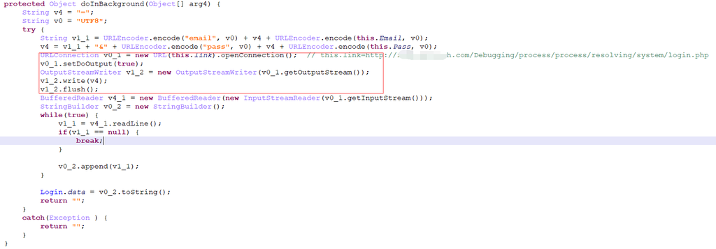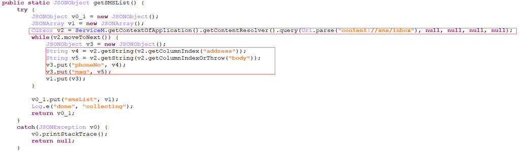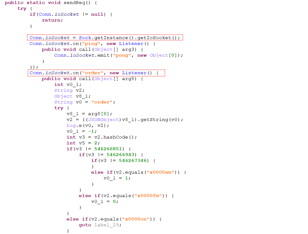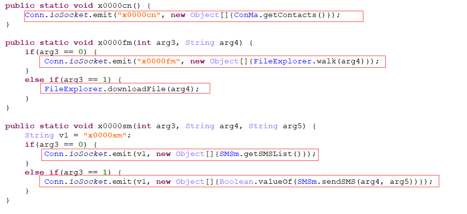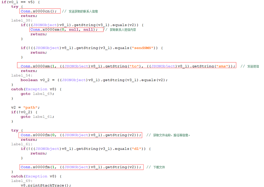 恶意行为:该间谍软件通过C&C通信,根据控制端发送的不同指令,执行窃取用户联系人信息、短信信息、收集存储在设备上的文件以及利用设备发送短信恶意行为。并在用户注册登录时窃取用户登录凭证。