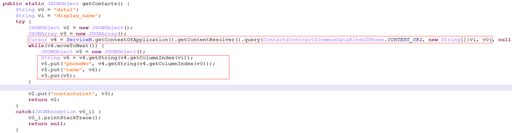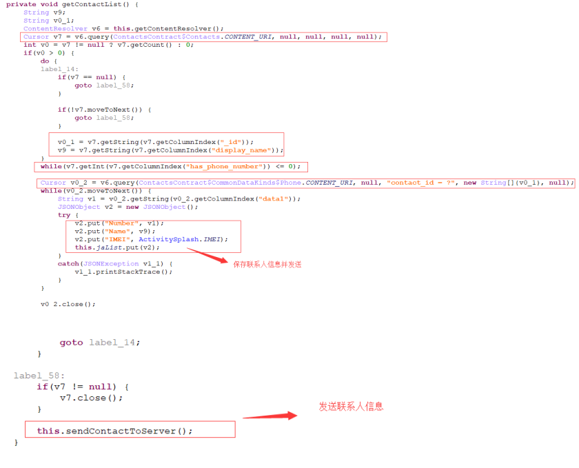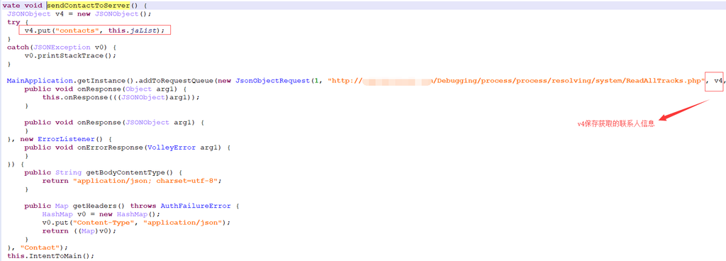 如果用户已授予读取联系人权限,则获取联系人列表信息并发送至服务器:http://ra***ch.com/Debugging/process/process/resolving/system/ReadAllTracks.php