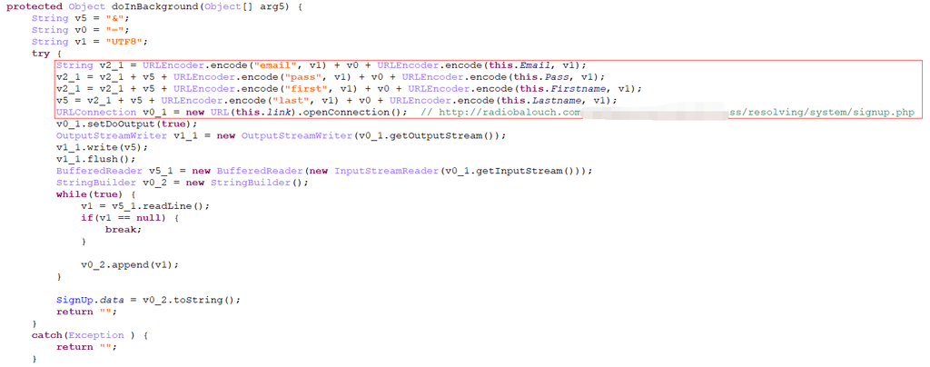 任何“注册”都是没有意义的,因为任何输入都会将用户带入“登录”状态。由此可以看出应用添加注册登录功能仅仅为了获取受害者登录凭证。