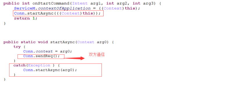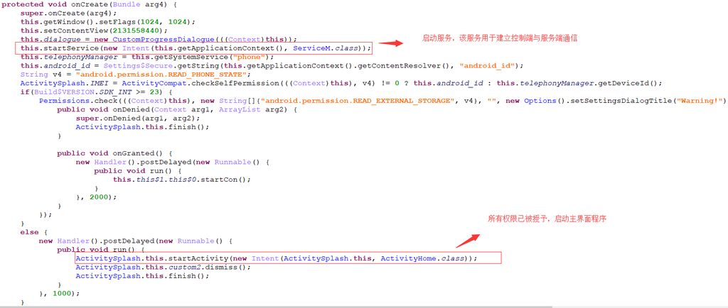 如果程序申请的所有权限已被授予,则启动主界面程序。程序在申请权限之前启动了ServiceM服务,该服务用于建立控制端与服务器通信,客户端根据接收的控制端指令执行不同操作来获取用户数据。