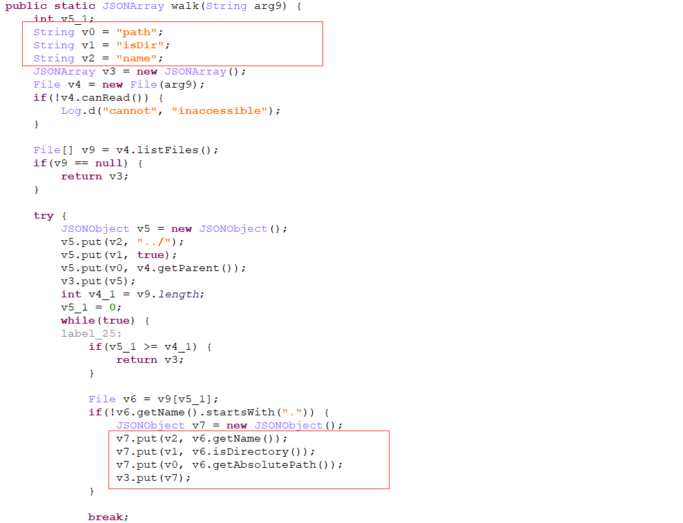 解析指令order,当getString(order).getString(extra)==ls时,遍历指定文件file=getString(order).getString(path)目录、获取文件名称、路径等信息。