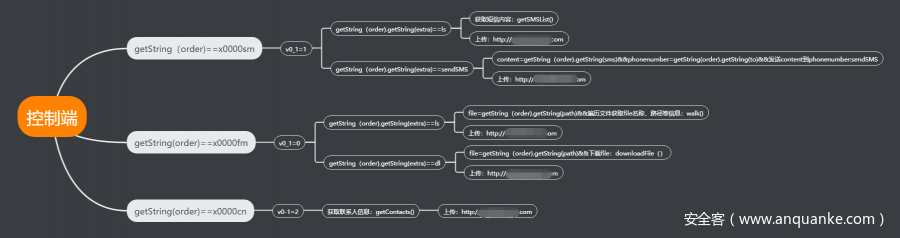 客户端通过解析控制端发送的指令order执行获取联系人信息、短信信息、文件信息以及发送短信等不同操作并将收集的信息发送至控制端:http://ra***ch.com。