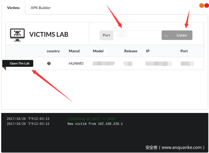 将AhMyth框架集成到apk中,输入监听端口,等待主机上线。