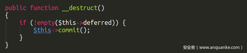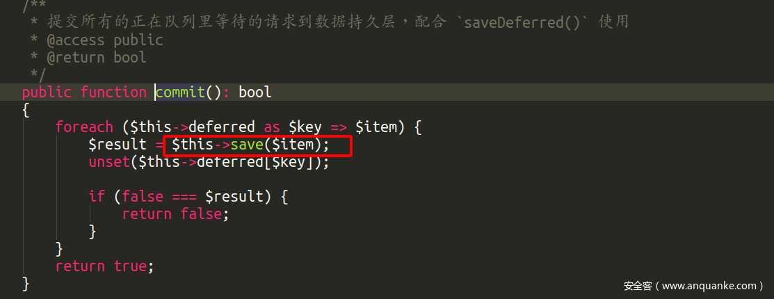 跟进commit函数,$this->deferred是可控的,save函数参数也就是可控的。
