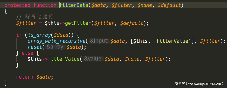 进入input函数,想要进入下面的filterData函数且满足第一个参数可控