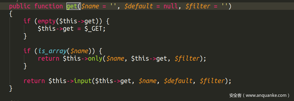 再全局搜索get函数,看到think/Request里面有,分析过最开始的5.1反序列化的POP链的人都知道,最后的RCE点就在这个类。get函数里有input函数,前两个参数完全可控。