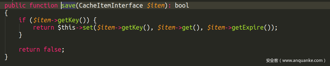 再跟进save函数,$item完全可控,它必须是一个CacheItemInterface对象。