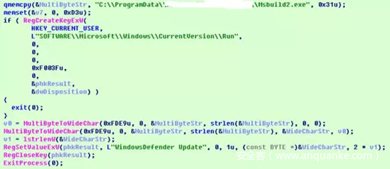 HKCU\Software\Microsoft\Windows\CurrentVersion\Run下添加项名为WindowsDefender Update的启动项,路径指向木马文件MsBuild2.exe。