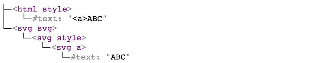 这个DOM树人畜无害,所有元素都位于DOMPurify的允许列表中。要注意的是,mglyph位于HTML命名空间中,而看上去像是XSS的payload则是html style中的一个文本。由于这里有个嵌套html form,因此在重解析时会出现突变。