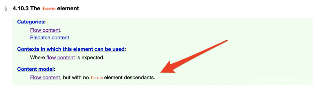 其中有种场景与FORM元素有关。这是HTML中非常特殊的一个元素,该元素无法嵌套到自身中。在HTML规范中,明确说明FORM元素不可以是某个FORM元素的后继: