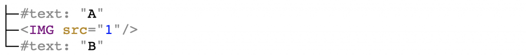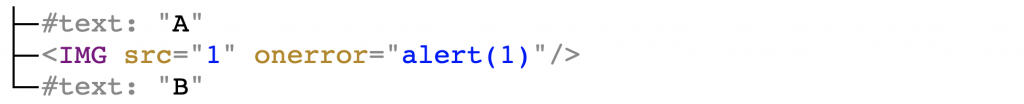 来看个简单例子。假设我们初始的内容的A<img src=1 onerror=alert(1)>B。在第1个步骤中,该片段会被解析成如下树结构: