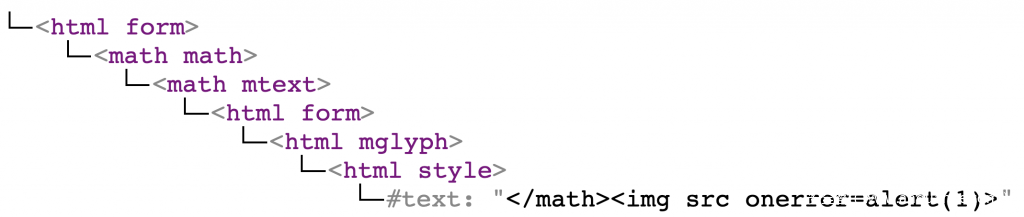这个payload用到了错误嵌套的html form元素,也包含mglyph元素,会生成如下DOM树: