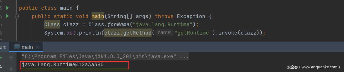 Object runtime = getRuntime.invoke(clazz);//实例化getRuntime方法