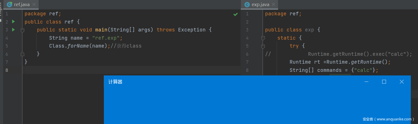这里第二函数中的第二个参数表示是否初始化,而这里的是否初始化是告诉Java虚拟机是否执⾏”类初始化“。其中, static {} 就是在”类初始化”的时候调⽤的,⽽ {} 中的代码会放在构造函数的 super() 后⾯,但在当前构造函数内容的前⾯。所以说我们如果控制一个恶意类,使用forName(“恶意类”)去获得就可能执行恶意代码。