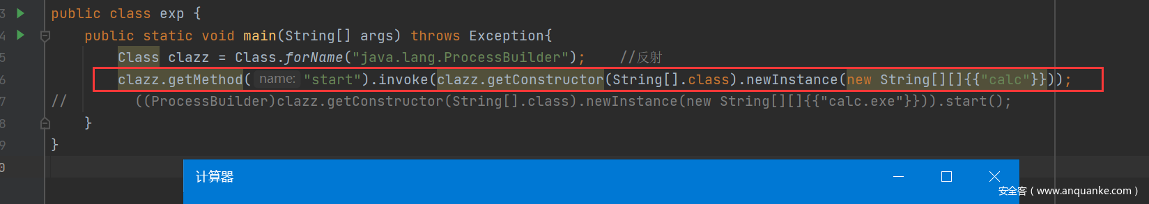 clazz.getMethod("exec", String.class).invoke(clazz.getMethod("getRuntime").invoke(clazz), "calc.exe");
