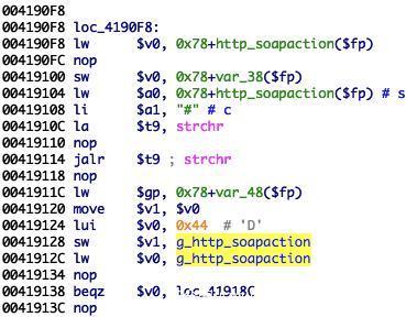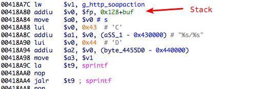跟进vulnerable_sprintf_parser可以发现程序未进行边界检查便将全局变量g_http_soapaction通过sprintf写到栈上: