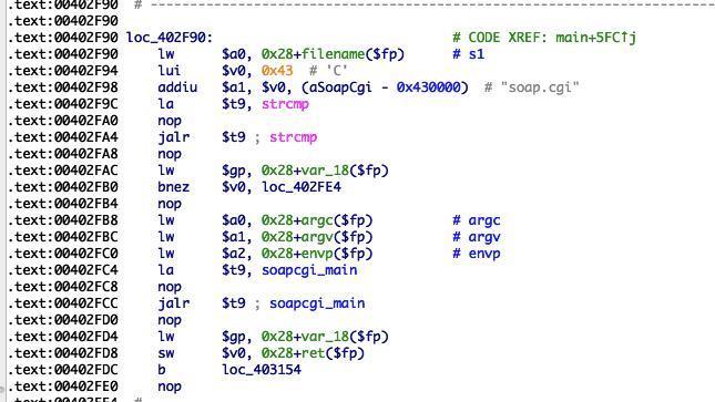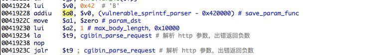 参数save_param_func用于传入解析/存储HTTP请求的具体handler,读取HTTP请求后使用该handler具体处理用户输入。在soapcgi_main(0x00418E28)中传入了漏洞函数vulnerable_sprintf_parser(0x0041893C):