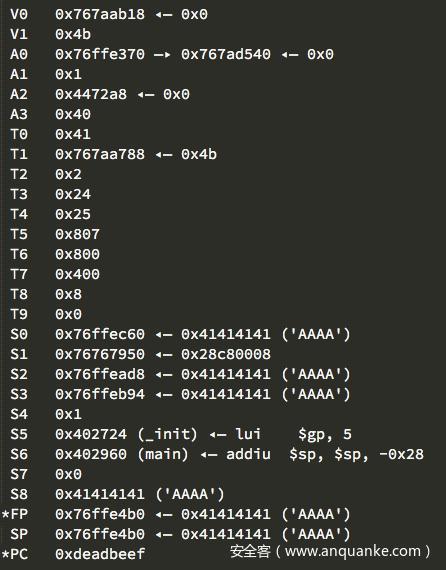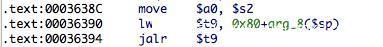 $S0、$S2-S3、$FP、$SP指向的内存可控,要编写ROP只能在这几个寄存器上做文章,最终用ropper在uClibc中找了个很不错的gadget: