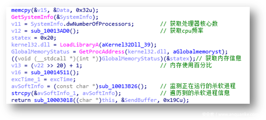 当与服务器建立通讯后,会尝试获取计算机配置信息,包括处理器核心数、cpu频率、内存使用百分比等,并且会尝试遍历进程,查询是否有杀软进程或者指定的进程: