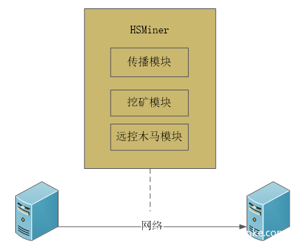 HSMiner带了一个远控木马,该木马采用 VC 编写,运行后释放一个 DLL 文件,并将该DLL注册为系统服务运行。
