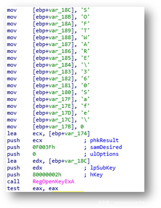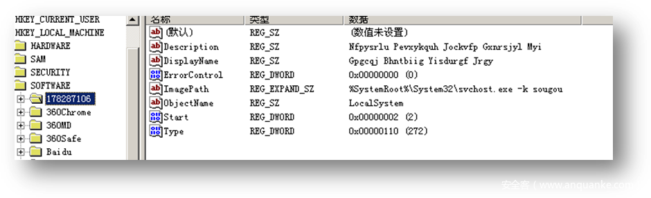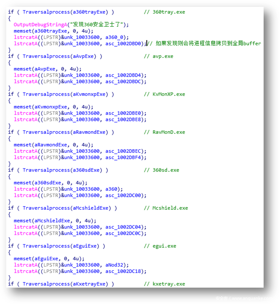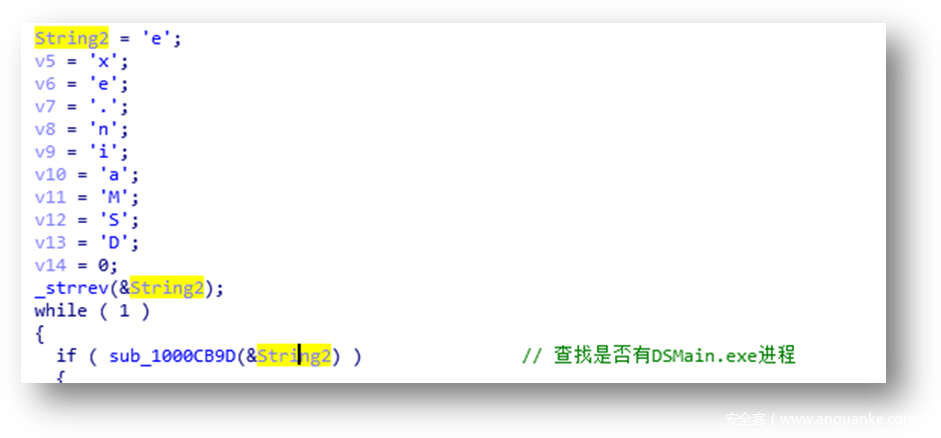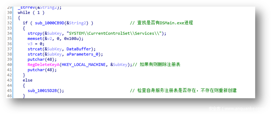 首先创建线程,遍历进程是否有DSMain.exe(进程名以倒序排列,该进程为360安全卫士在查杀病毒时启动的杀毒模块),如果发现该进程,样本会删除自身创建的服务注册表: