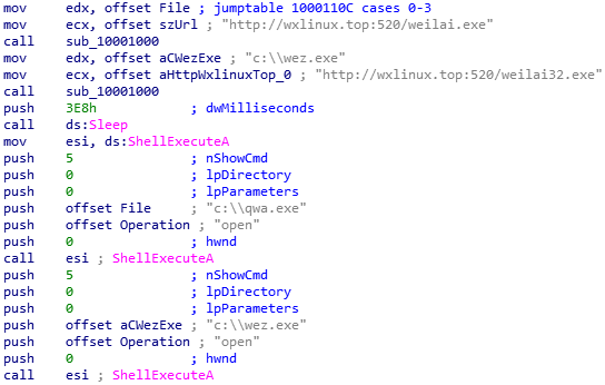 该代码主要用于下载病毒完整程序包,下载文件随后更名为”C:\qwa.exe” 并运行安装,简单粗暴。