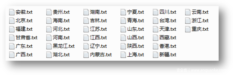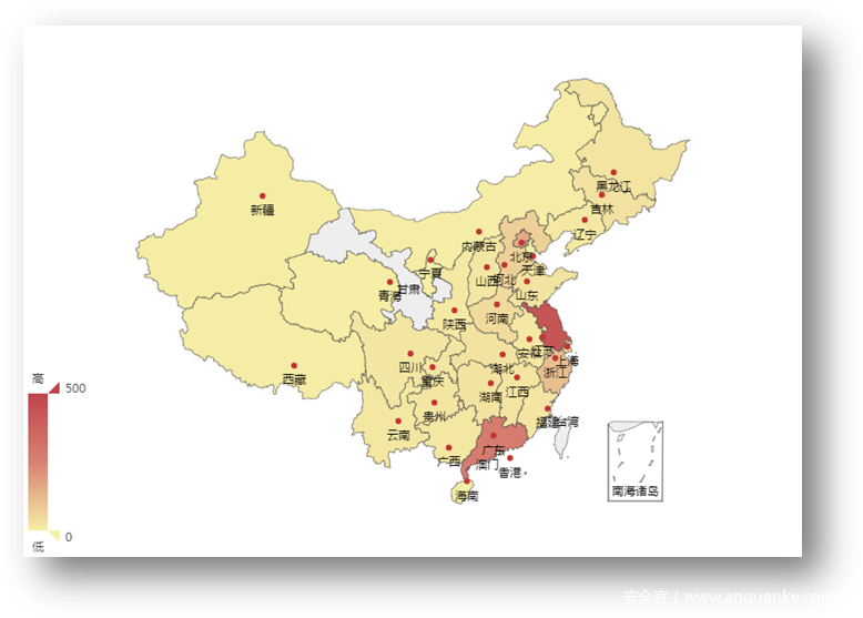 继续基于本次挖矿病毒访问的矿池地址a.wxkuangji.com域名解析数据统计结果进行分析,分析结果显示全国多个地区均被感染了该类病毒,并且江苏和广东这两大发达地区是本次攻击的重点区域: