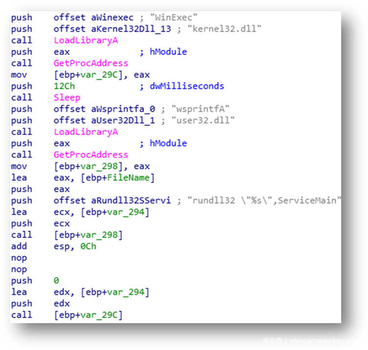 如果安装有360安全卫士则退出执行,否则调用WinExec来运行rundll32.exe,通过这种方式加载运行dll: