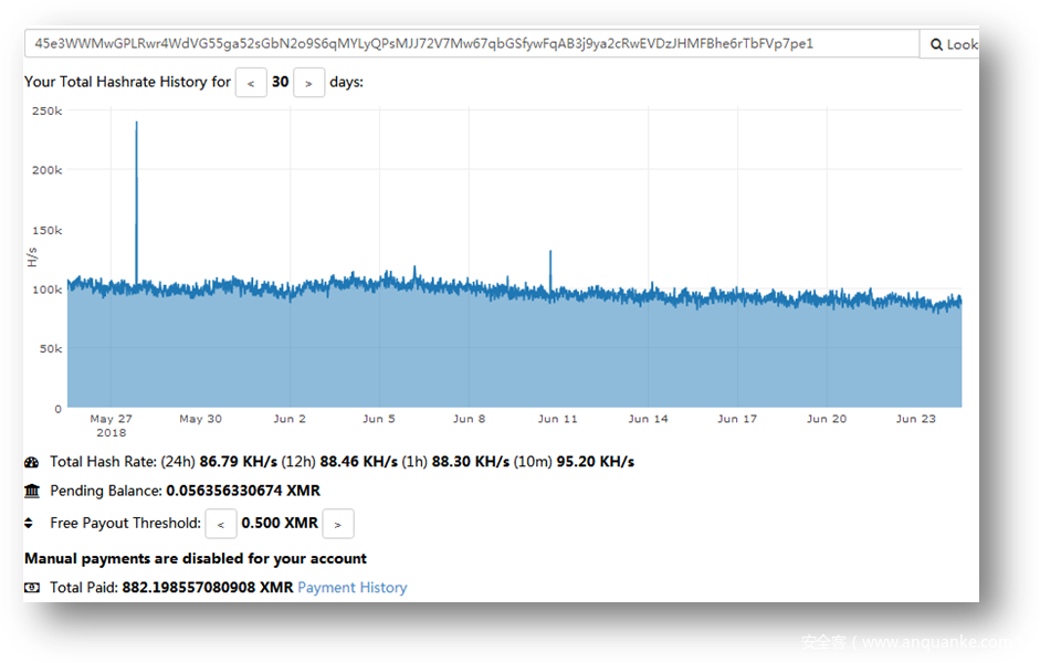 由上述分析可见,HSMiner挖矿病毒采用简单有效的方式进行传播,并附带了成熟完备的远控木马,从分析可见该病毒背后团伙应该是国内近段时间较为活跃某黑产组织。其挖矿获利已经接近1000XMR(近百万人民币),值得我们提高警惕,防患以未然。