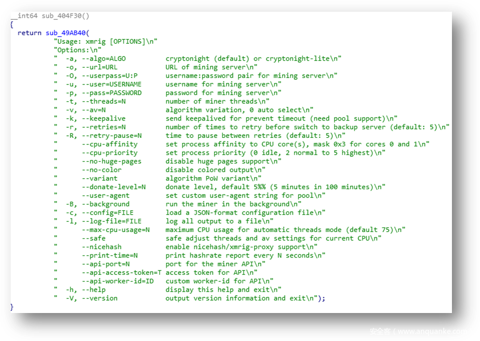挖矿程序本身是在开源程序xmrig基础上编译而来,如下图所示为程序命令行参数说明: