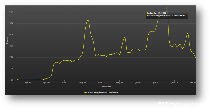 根据360网络研究院的全网数据抽样统计,对攻击者挖矿的矿池域名a.wxkuangji.com 的大量访问主要集中在2018年5月和6月,也就是说该病毒家族在最近两个月进行了疯狂的传播并大肆敛财: