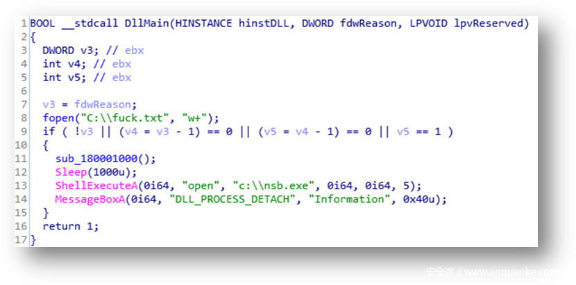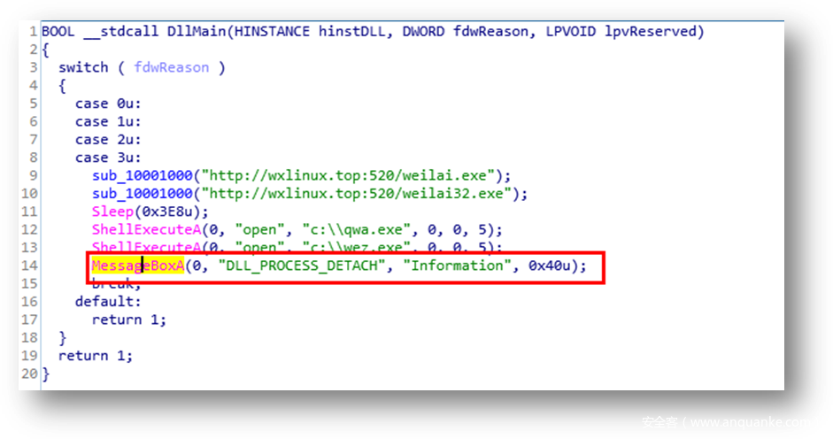 之所以说是测试的样本,是因为该DLL加载入口处包含MessageBox函数: