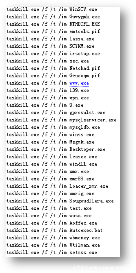 我们在分析中还发现该家族存在多个变种,其中部分变种有黑吃黑现象,也即这些变种在挖矿前,会将其他挖矿、勒索、木马等病毒来一次大扫荡,以便于自身不被其他病毒影响从而更好地利用系统资源进行挖矿,如下图所示为部分脚本: