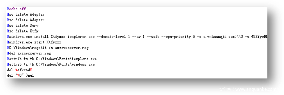如上图所示,通过第三方服务管理工具windows.exe将挖矿程序 iexplorer.exe以服务形式安装在计算机中。