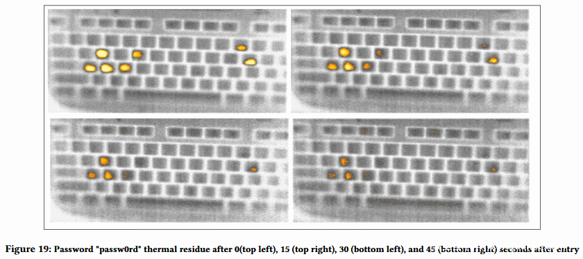 攻击者需要将具有记录热感功能的相机放到受害者附近,为了使热残留物攻击可行,相机必须能清晰地拍到受害人的键盘按键。当然,这对于攻击者来说并不难办。