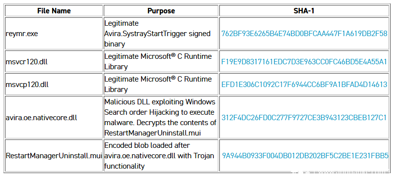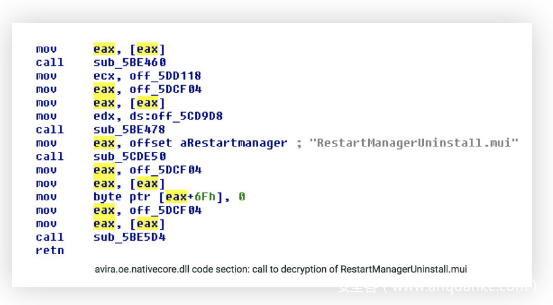 执行reymr.exe后,它将加载假的DLL(avira.oe.nativecore.dll)并解密payload(RestartManagerUninstall.mui):
