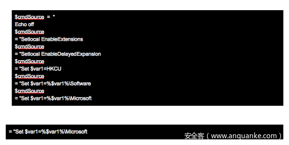完整的批处理文件脚本由PowerShell脚本动态构建。在这里,我们看到它是使用环境变量构建的。